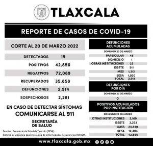 REGISTRA SESA 19 CASOS POSITIVOS Y CERO DEFUNCIONES DE COVID-19 EN TLAXCALA