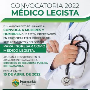 ÚLTIMOS DÍAS PARA PARTICIPAR EN LA CONVOCATORIA DE RECLUTAMIENTO PARA MÉDICO LEGISTA MUNICIPAL: AYUNTAMIENTO DE HUAMANTLA