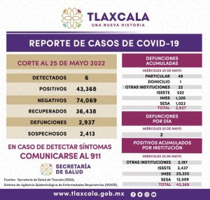 REGISTRA SESA 6 CASOS POSITIVOS Y DOS DEFUNCIONES DE COVID-19 EN TLAXCALA