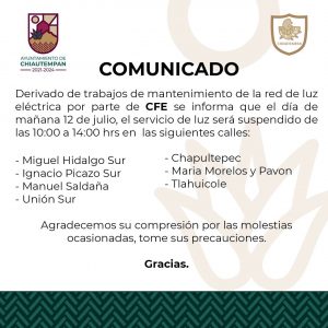 CFE suspenderá servicio de energía eléctrica en calles céntricas de Chiautempan