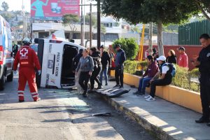 Ocho lesionados deja choque y volcadura de unidad del transporte público en el Trébol; un vehículo March la impactó