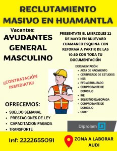 AYUNTAMIENTO DE HUAMANTLA Y EMPRESA DIPROLAM INVITAN A PARTICIPAR EN LA VACANTE DE AYUDANTE GENERAL