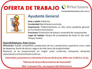 REALIZARÁ EMPRESA TI FLUID SYSTEMS RECLUTAMIENTO EN LA COORDINACIÓN DE DESARROLLO ECONÓMICO DE HUAMANTLA