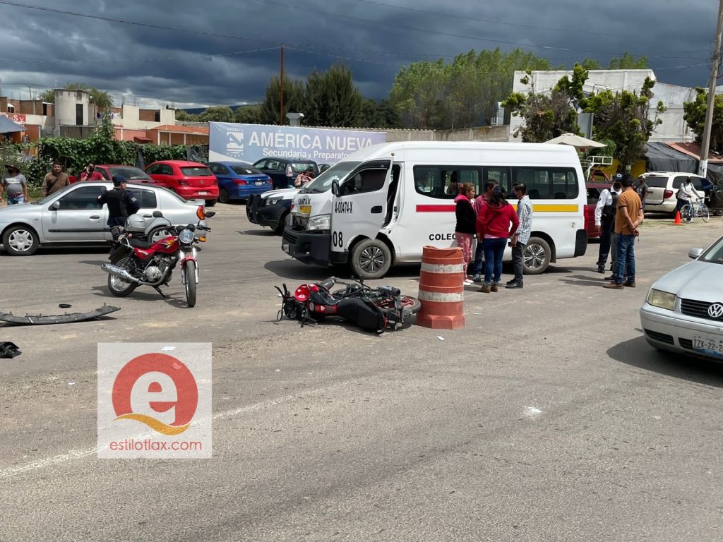 Datos recabados indican que el conductor de la motocicleta resultó con lesiones de consideración, mientras el chofer de la unidad colectiva de la ruta La Magdalena Tlaltelulco-Santa Ana habría quedado asegurado.