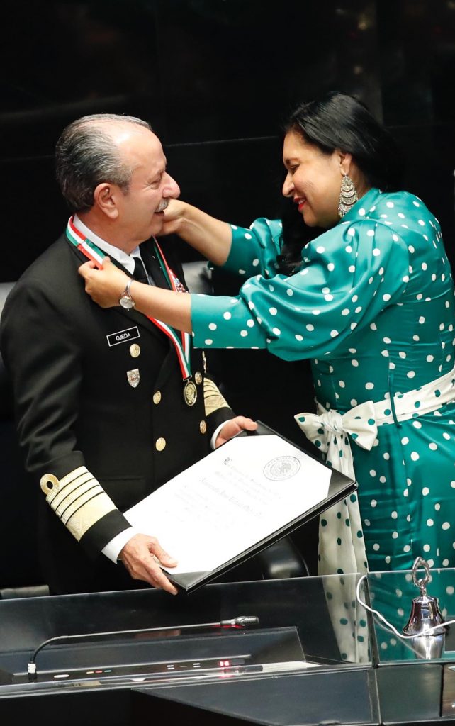 Ante el Pleno de la Cámara, la presidenta de la Mesa Directiva, Ana Lilia Rivera Rivera, le entregó la presea al secretario de Marina, galardón que también subraya la dedicación y el compromiso excepcionales de la Semar para proteger y servir a nuestra nación.