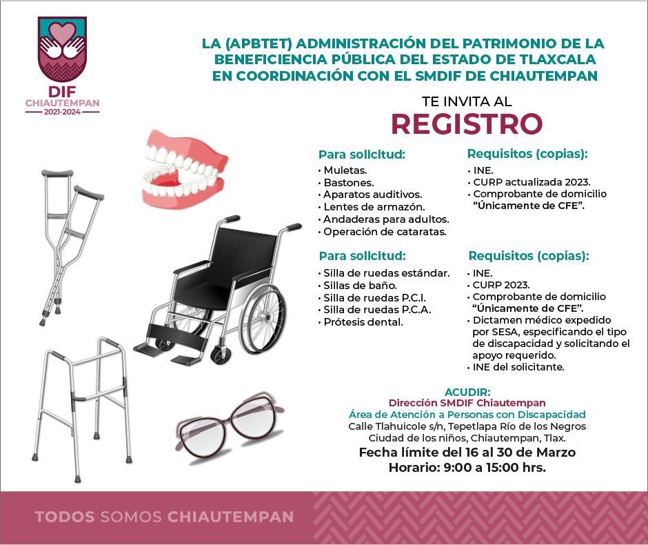 El Sistema Municipal para el Desarrollo Integral de la Familia (SMDIF) y en coordinación y con el apoyo de la Administración del Patrimonio de la Beneficencia Pública del Estado de Tlaxcala (APBPET), abren del 16 al 30 de marzo el registro para obtener de manera gratuita apoyos funcionales.