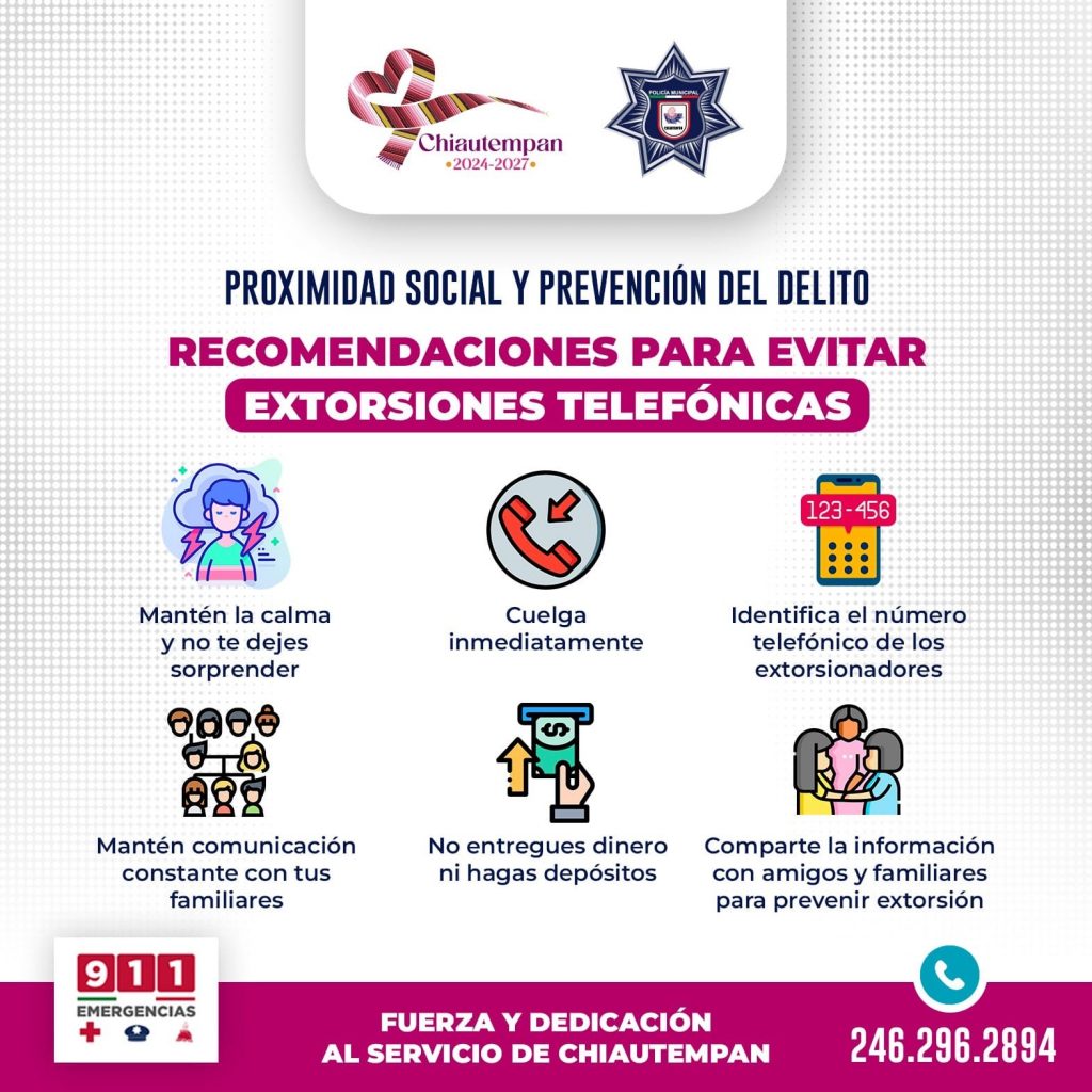 La presidencia municipal de Chiautempan emitió una alerta contra llamadas telefónicas que pueden constituir una extorsión y que realizan a nombre de la alcaldesa Blanca Angulo Meneses, lo cual es totalmente falso, por lo que se invita a la ciudadanía que reciba esas llamadas a reportarlo al número de atención 911 o para orientación al 2462962894.