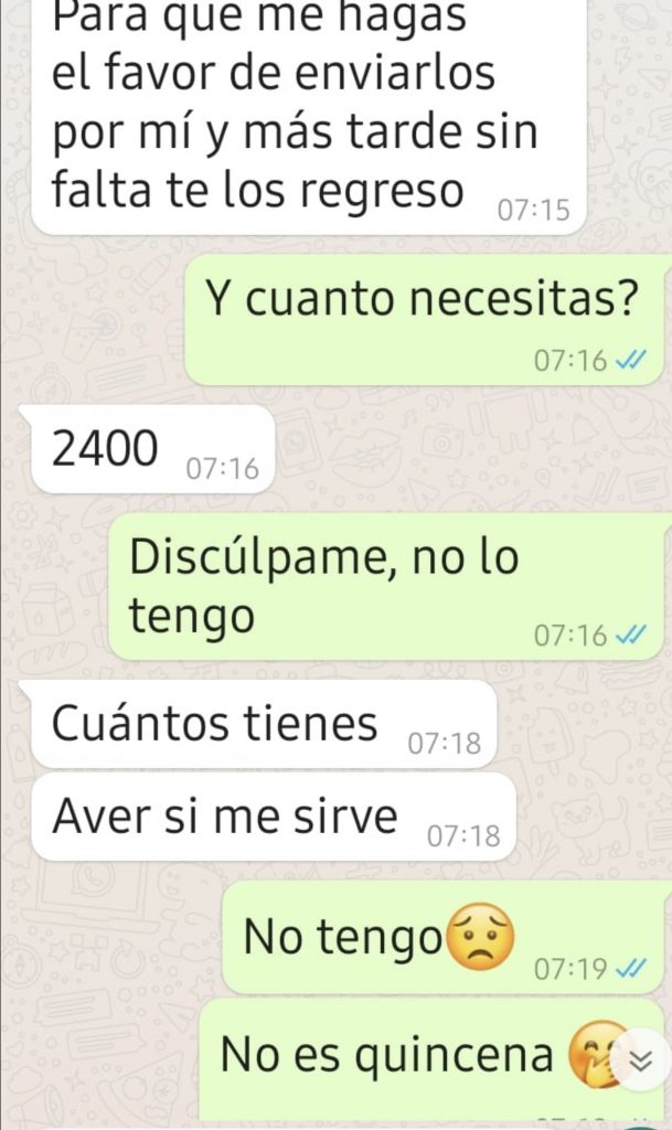 Este mensaje lo hacen llegar de madrugada para que el propietario del número no se dé cuenta y de esta forma puedan “caer” algunas personas que en su afán de apoyar realizan el depósito a la cuenta del extorsionador.