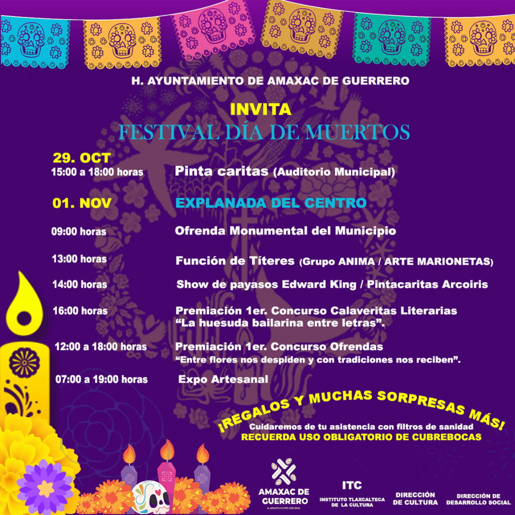 A las cuatro de la tarde se realizará la premiación del 1er concurso de Calaveritas Literarias “La huesuda bailarina entre letras”, que actualmente se encuentra activa para recibir las votaciones en la página oficial de Facebook, H. Ayuntamiento Amaxac de Guerrero. Las actividades concluirán con la premiación del 1er concurso de ofrendas “Entre flore nos despiden y con tradiciones nos reciben”.