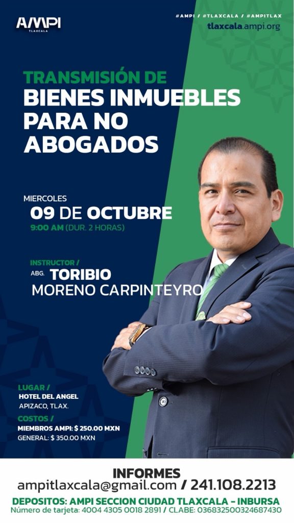 Como parte de las actividades de capacitación que lleva a cabo la Asociación Mexicana de Profesionales Inmobiliarios (AMPI) Tlaxcala, ofreció una conferencia titulada “Transmisión de Bienes Inmuebles para No Abogados”.