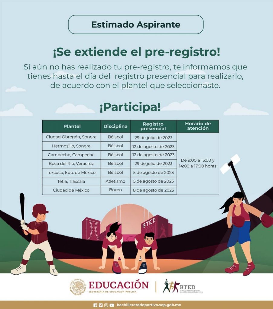 Como parte del proceso de selección, los aspirantes deben realizar su pre–registro digital en la página oficial bachilleratodeportivo.sep.gob.mx hasta el 5 de agosto, y una vez cumplidos los requisitos que marca la convocatoria, se realizará el registro presencial de folio digital y documentos, así como la aplicación del examen académico.