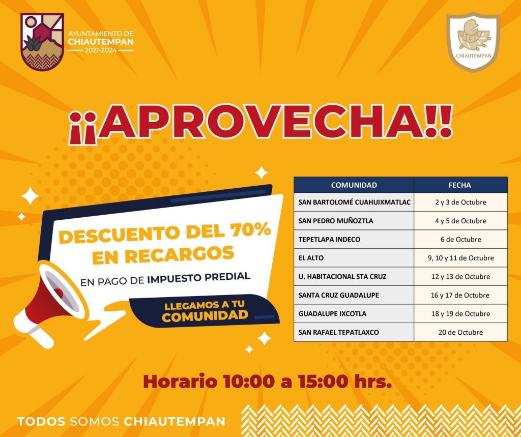 El Ayuntamiento de Chiautempan a través de la Tesorería Municipal, anunció la puesta en marcha de la Caja Itinerante para pago del impuesto predial, la cual, visitará todas las comunidades, colonias y barrios del municipio con una oferta del 70 por ciento de descuento en recargos en un horario de las 10:00 a las 17:00 horas, dependiendo la comunidad.