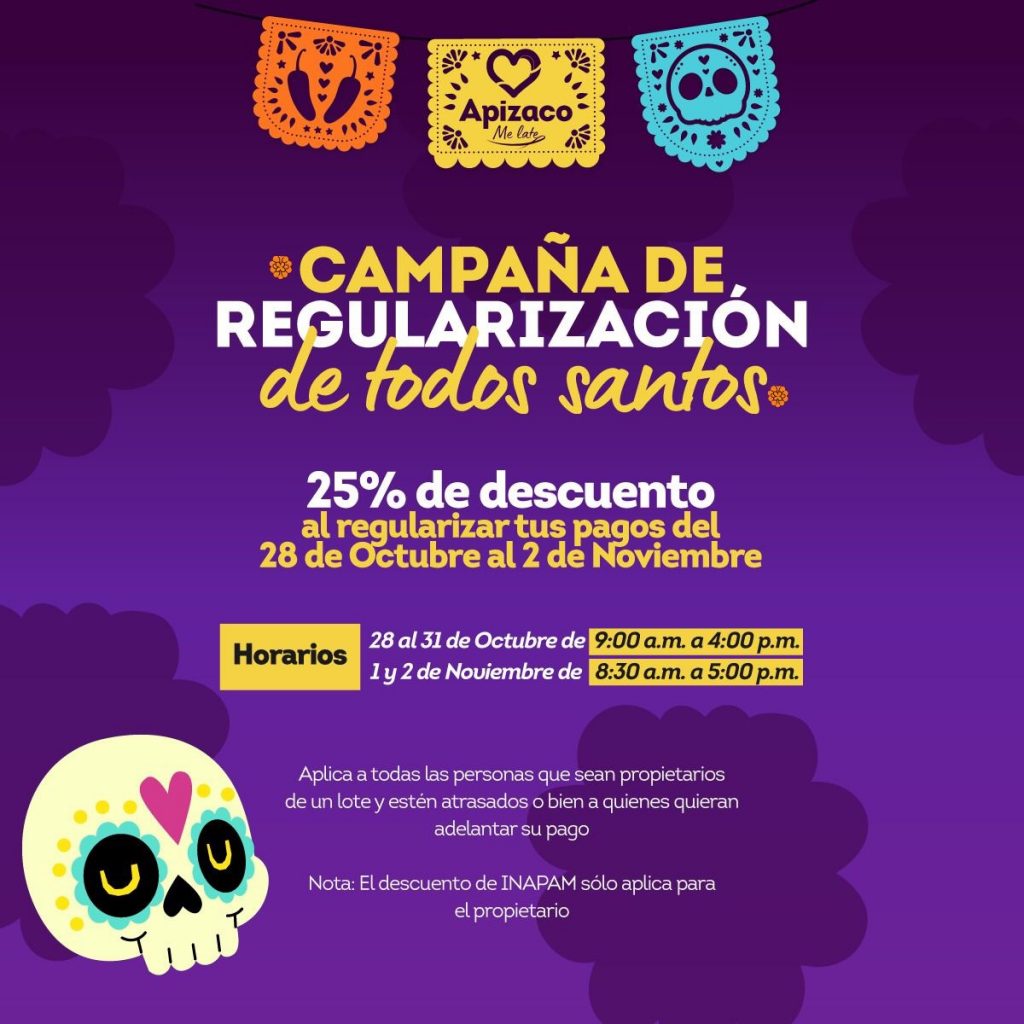 El Gobierno de Apizaco dio a conocer la campaña de regularización de Todos los Santos, que consiste en un descuento del 25 por ciento en predios del Panteon Municipal, del 28 de octubre al 2 de noviembre