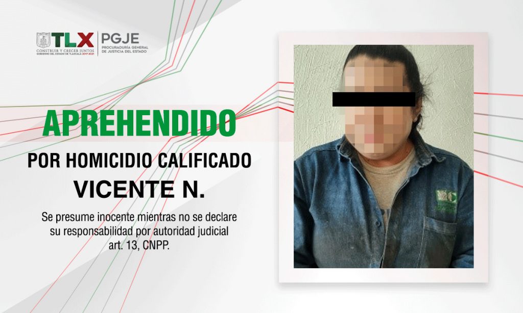 La Policía de Investigación adscrita a la Procuraduría General de Justicia del Estado (PGJE), logró la aprehensión de Vicente N., quien cuenta con un proceso en su contra por su participación en un homicidio calificado ocurrido en 2004 en el municipio de Apizaco.
