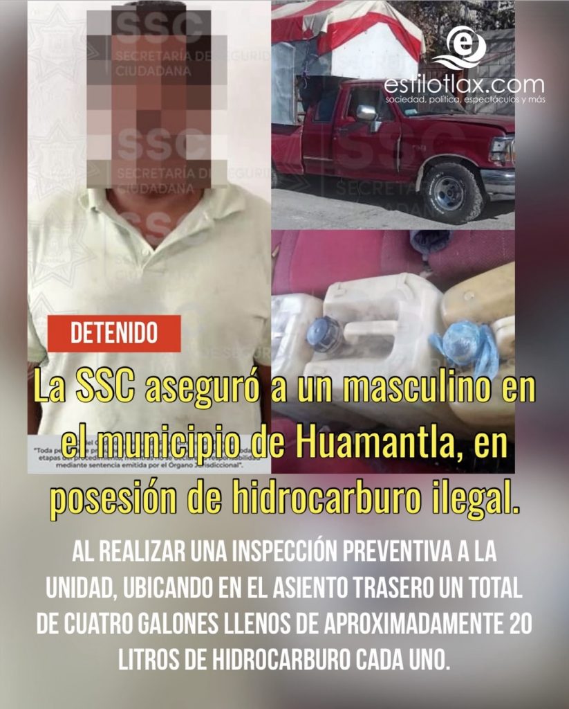 Resultado de despliegues operativos en puntos estratégicos de Tlaxcala, la Secretaría de Seguridad Ciudadana (SSC) aseguró a un masculino en el municipio de Huamantla, en posesión de hidrocarburo ilegal.