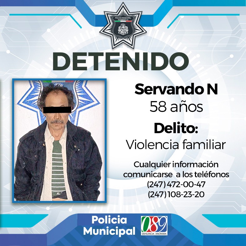 El detenido se identificó como Servando N., de 58 años de edad, quien fue señalado directamente por testigos oculares de haber golpeado a su progenitor, esto en un domicilio de la calle Tláloc, en el barrio antes referido.