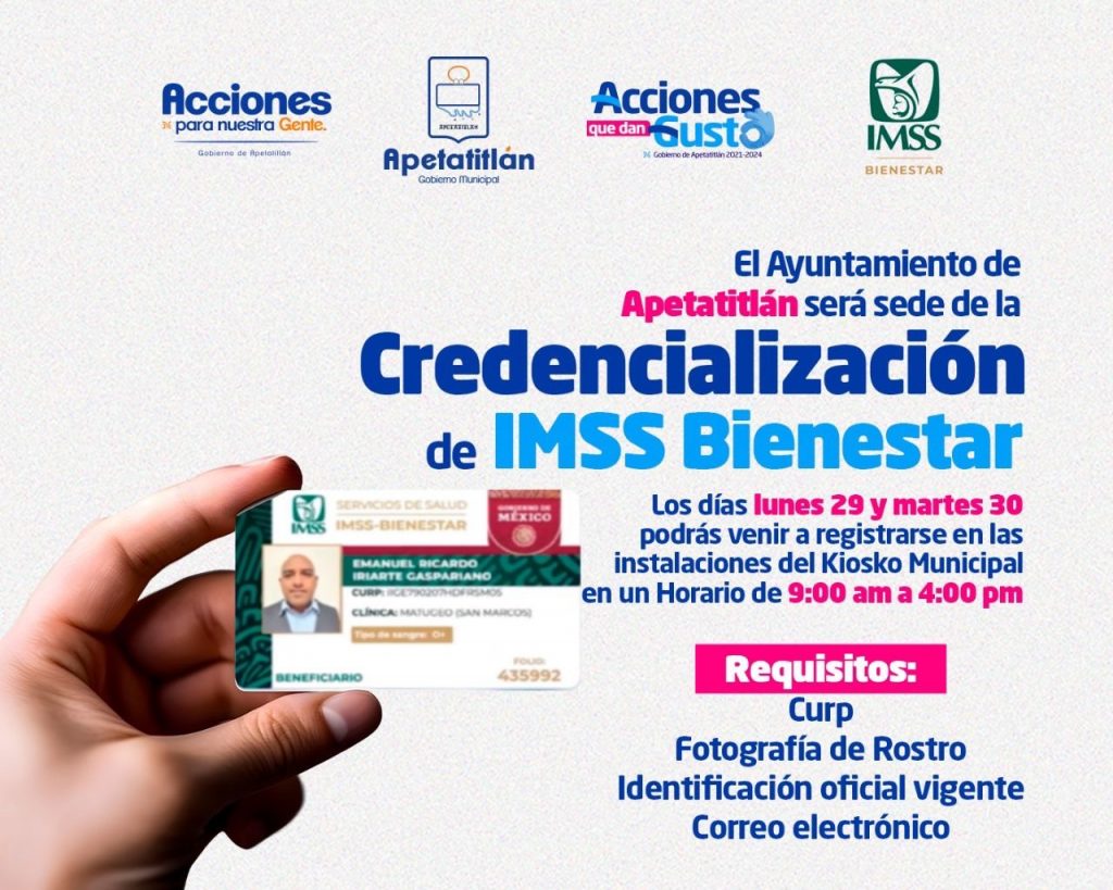 Pese a esas posiciones confrontativas que en nada abonan al trabajo en beneficio de la población seguimos trabajando por lo que este lunes, en el kiosco municipal, todas las personas que carecen de seguridad social podrán acudir a registrarse al IMSS -Bienestar, para lo cual deberán acudir con su Clave Única de Registro de Población (CURP), fotografía, una identificación oficial vigente y un correo electrónico.En Apetatitlán seguimos trabajando en acciones que dan gusto