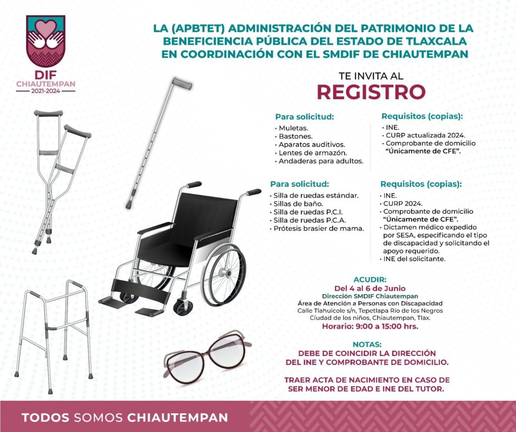 El Ayuntamiento de Chiautempan a través de la Administración del Patrimonio de la Beneficencia Pública del Estado de Tlaxcala (APBTET) y en coordinación con el Sistema Municipal DIF (SMDIF), invitan al registro de aparatos funcionales y sillas de rueda.