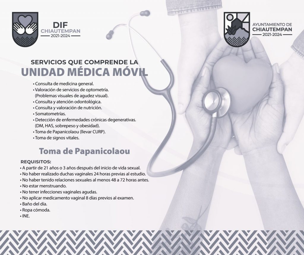 Se les recuerda a la ciudadanía que los servicios a ofertan son: consulta de medicina general, valoración de servicios de optometría, consulta y atención odontológica, así como, consulta y valoración de nutrición, somatometrías, detención de enfermedades crónico degenerativas, tomas de signos vitales y tomas de Papanicolaou (llevar CURP).