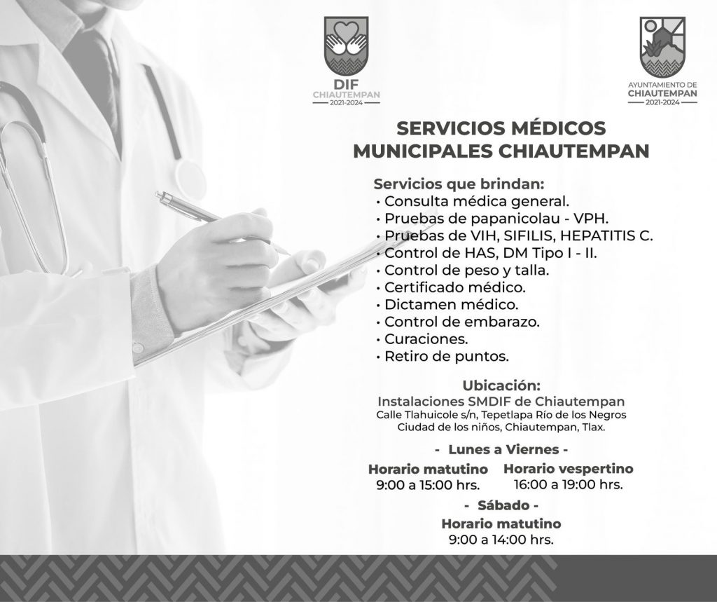 El Ayuntamiento de Chiautempan a través del Sistema Municipal para el Desarrollo Integral de la Familia (SMDIF) invita a toda la población a consultar los servicios médicos municipales.
