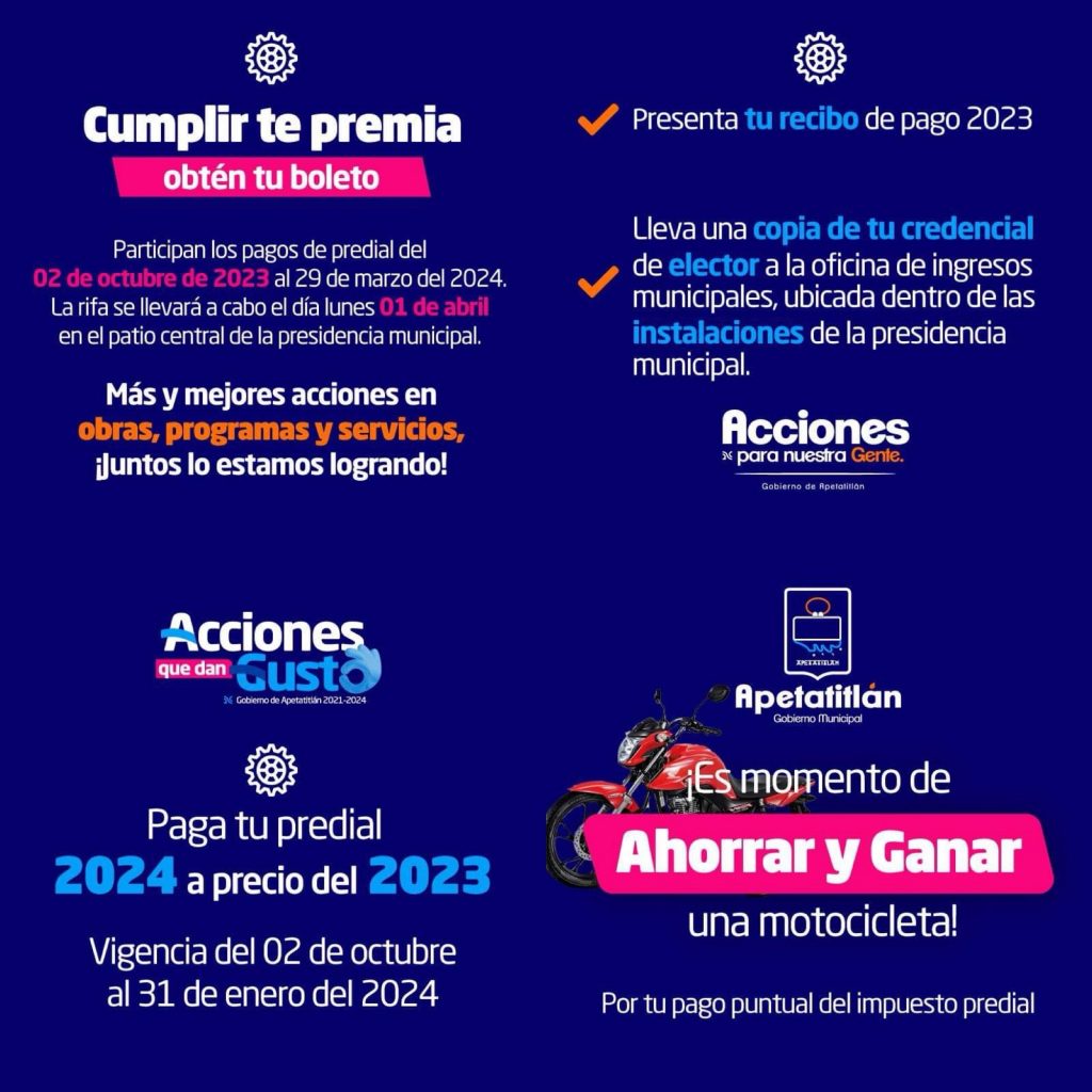 De igual forma, el alcalde, bajo el lema “es momento de ahorrar y ganar”, con la finalidad de incentivar y premiar el cumplimiento de las obligaciones, quienes paguen de manera puntual el impuesto predial antes del 29 de marzo del año 2024, podrán acceder a la rifa de una motocicleta.