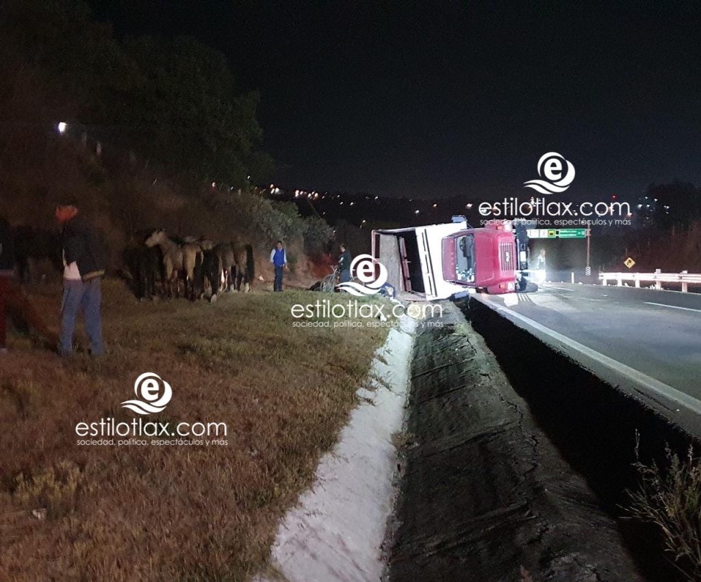 Sin que se registrarán victímas por fortuna una unidad pesada cargada de caballos y yeguas sobre la carretera Apizaco- Tlaxcala a la altura de San Esteban Tizatlán ocasionó un severo caos vial.