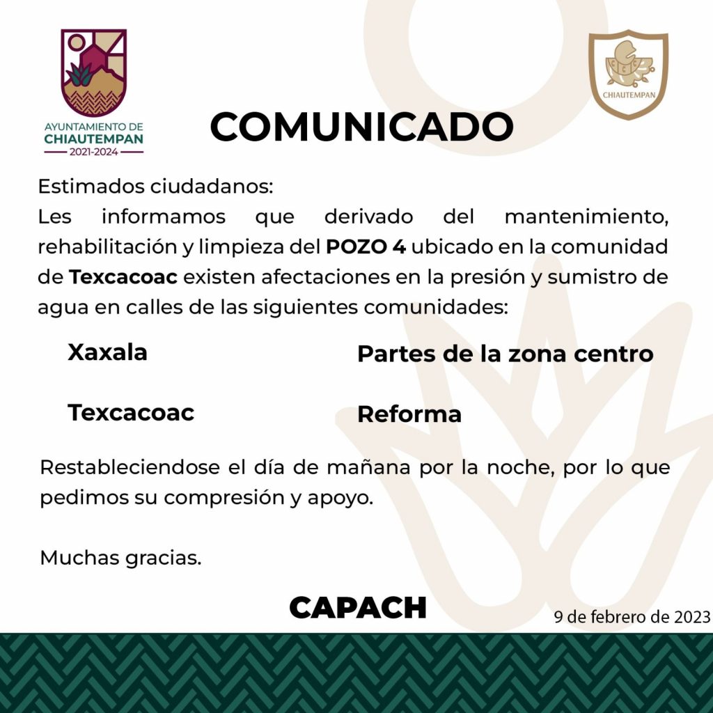 Por ese motivo existen afectaciones en la presión y suministro de agua en algunas calles de las siguientes comunidades: Xaxala, Texcacoac, Reforma y parte de la zona centro.