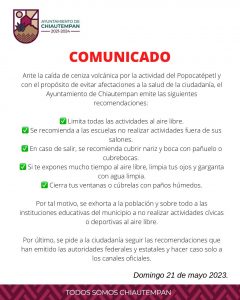 Emite Ayuntamiento de Chiautempan las siguientes recomendaciones por caída de ceniza volcánica