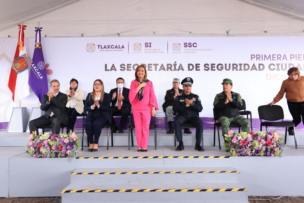 La gobernadora Lorena Cuéllar Cisneros, acompañada de autoridades de seguridad, del Poder Legislativo y del municipio de Tlaxcala, colocó la primera piedra de la etapa inicial de la Secretaría de Seguridad Ciudadana (SSC), con una inversión de 100 millones de pesos.