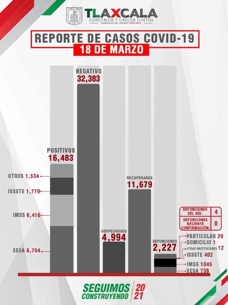 De acuerdo con el reporte del 18 de marzo, la Secretaría de Salud del Estado confirmó 13 personas recuperadas, 4 fallecimientos y 29 casos positivos de Covid-19 de tlaxcaltecas identificados en el estado y uno en otra entidad.