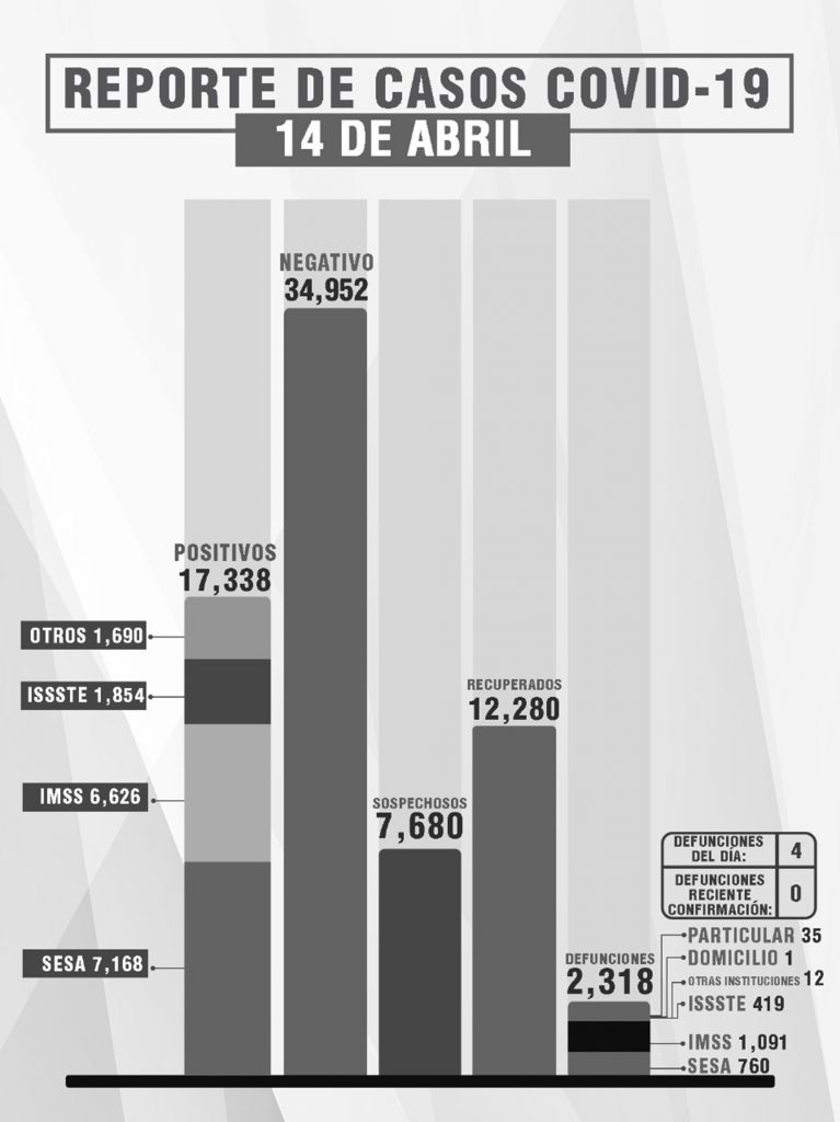 Mientras, del total de fallecimientos, 760 se han registrado en la SESA, mil 91 en el IMSS, 419 en el Issste, 12 en otras instituciones, uno en domicilio particular y 35 en hospital privado.
