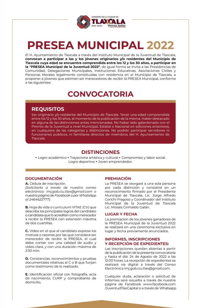 El Ayuntamiento de Tlaxcala Capital, a través del Instituto Municipal de la Juventud de Tlaxcala, invita a las y los jóvenes de 12 a 30 años de edad a inscribirse a la convocatoria para la “Presea Municipal de la Juventud 2022”.