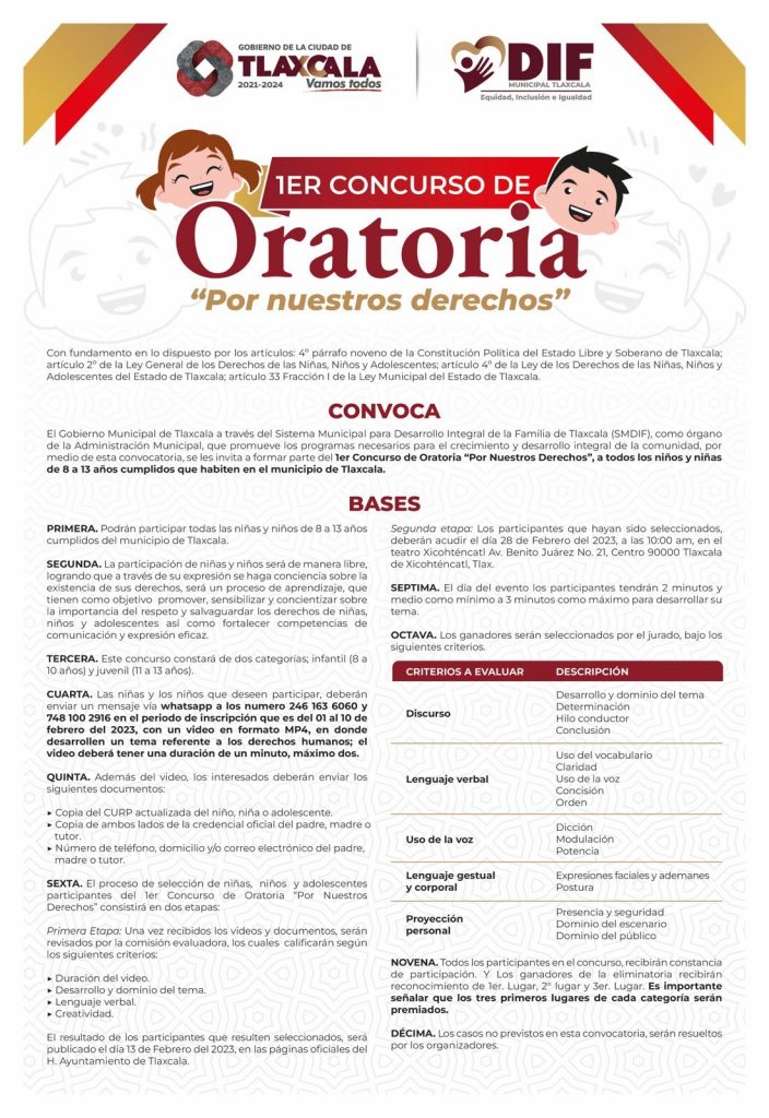 El Gobierno municipal de Tlaxcala a través de Sistema DIF, que preside en forma honorífica la señora Cecilia Herrejón, convoca a infantes de 8 a 13 años de edad, y que habiten en el municipio, a participar en el primer concurso de oratoria “POR NUESTROS DERECHOS” que se llevará a cabo el 28 de febrero próximo en el Teatro Xicohténcatl.