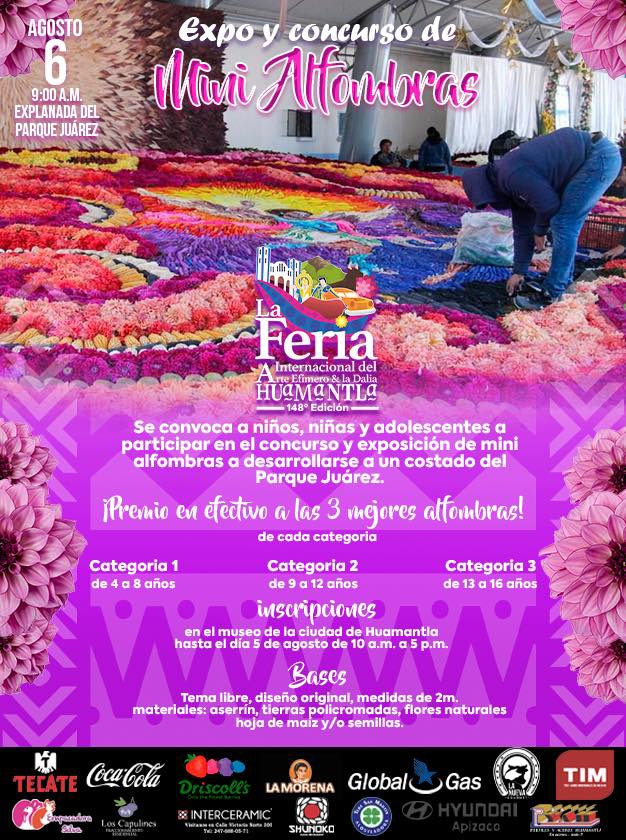 Con el objetivo de fortalecer las tradiciones y el arte efímero en el municipio, el H. Ayuntamiento de Huamantla que preside Salvador Santos Cedillo, invitan a las niñas, niños y adolescentes a participar en la “Expo y Concurso de Mini Alfombras 2022” este 6 de agosto en la explanada del Parque Juárez a las 9:00 horas.