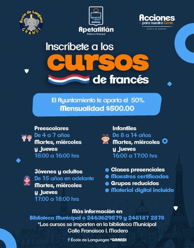 Con la finalidad de ampliar la oferta educativa y el panorama a los jóvenes, el ayuntamiento de Apetatitlán de Antonio Carvajal, que preside el panista Ángelo Gutiérrez Hernández, convoca a participar en el curso de francés, por medio del cual, los participantes aprenderán a comunicarse vía oral y escrita en ese idioma.