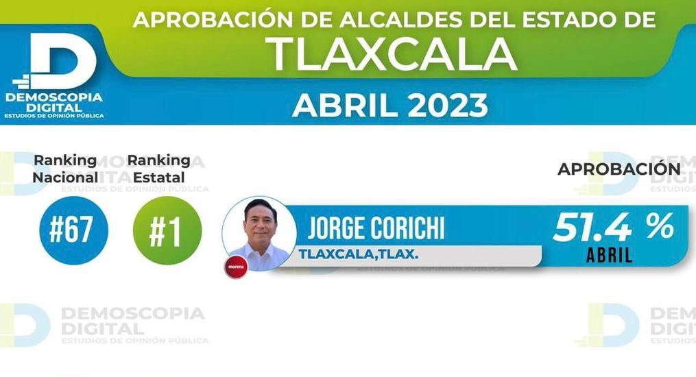 Corichi también tuvo progreso en el ranking nacional que realiza Demoscopia, al pasar del lugar 89 (en marzo) al 67 (en abril). Los datos de la encuestadora indican que es el único presidente municipal tlaxcalteca que se encuentra entre los primeros 100 de todo el país.