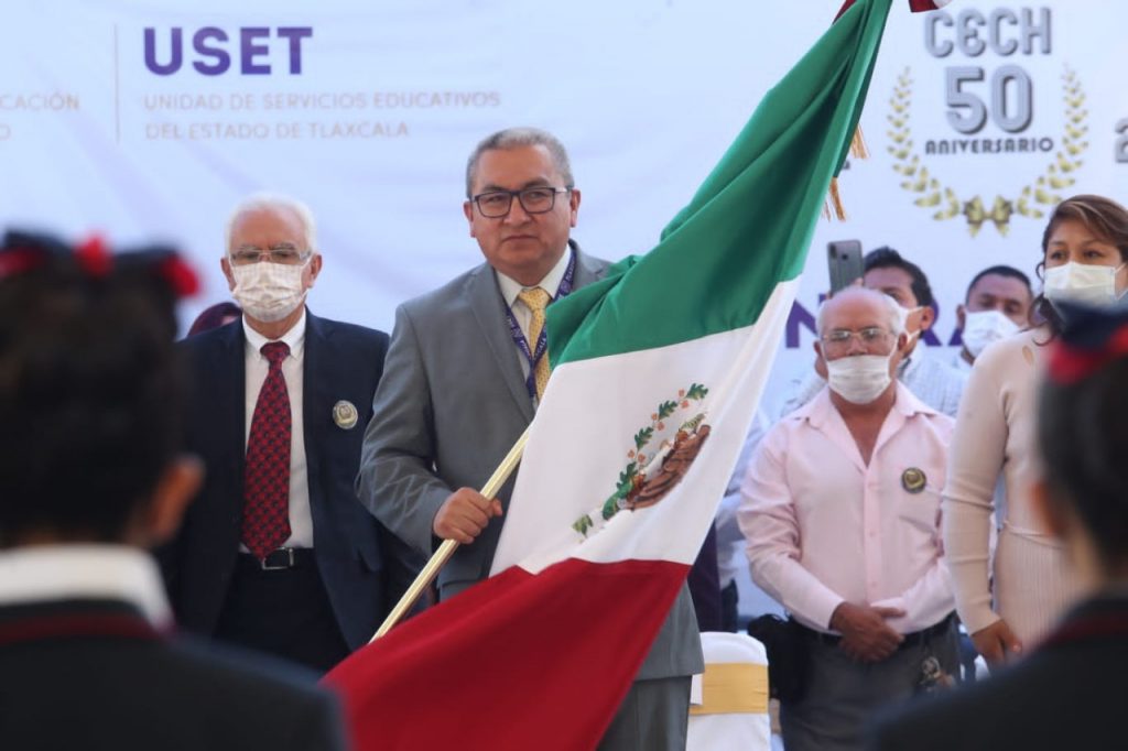El secretario de Educación Pública del estado, Homero Meneses Hernández abanderó a la escolta del Centro Escolar Chiautempan y develó la placa conmemorativa en el marco de los 50 años de la fundación de esa institución.