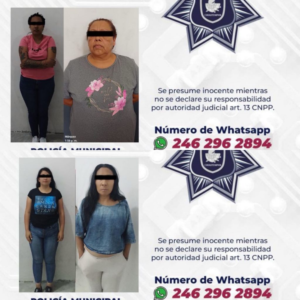 Elementos de la Dirección de Seguridad Pública Municipal, Vialidad y Protección Civil de Chiautempan, detuvieron a cuatro femeninas por su probable responsabilidad en el intento de hurto de productos de una tienda de autoservicio y daños a la misma.