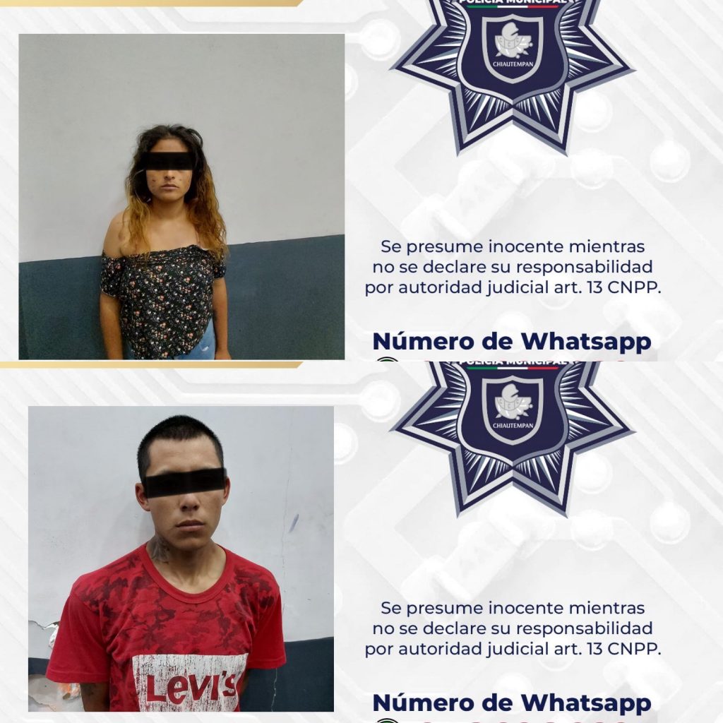De este modo, se llevó a cabo la detención de Dulce Esmeralda N., y Aarón N., de 24 y 19 años de edad, respectivamente, ambos originarios de Texcacoac. Las dos personas fueron puestas a disposición del Ministerio público para las investigaciones correspondientes por sus respectivos delitos.