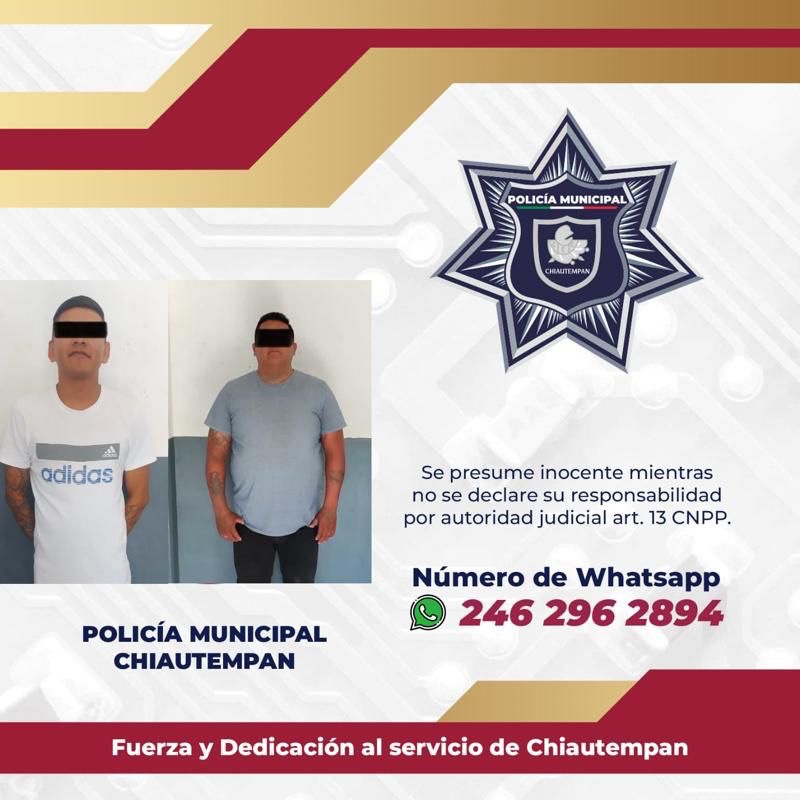 La rápida acción de la Dirección de Seguridad Pública Municipal Vialidad y Protección Civil de Chiautempan, permitió a elementos adscritos detener a dos sujetos por privación ilegal de la libertad y salvar a la víctima de la retención.