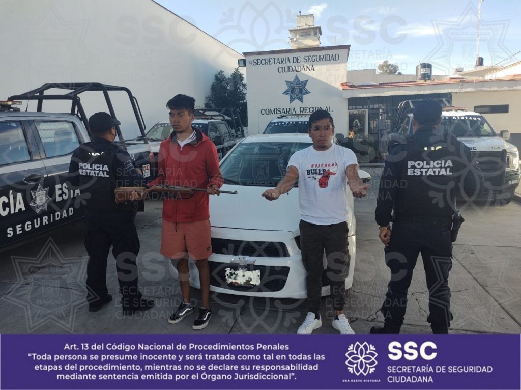 Elementos de la Dirección de Seguridad, delegación Tlaxcala, pertenecientes a la Secretaría de Seguridad Ciudadana (SSC), aseguraron a dos personas por portación de un arma de fuego, en la localidad de Santa María Acuitlapilco, del municipio de Tlaxcala.