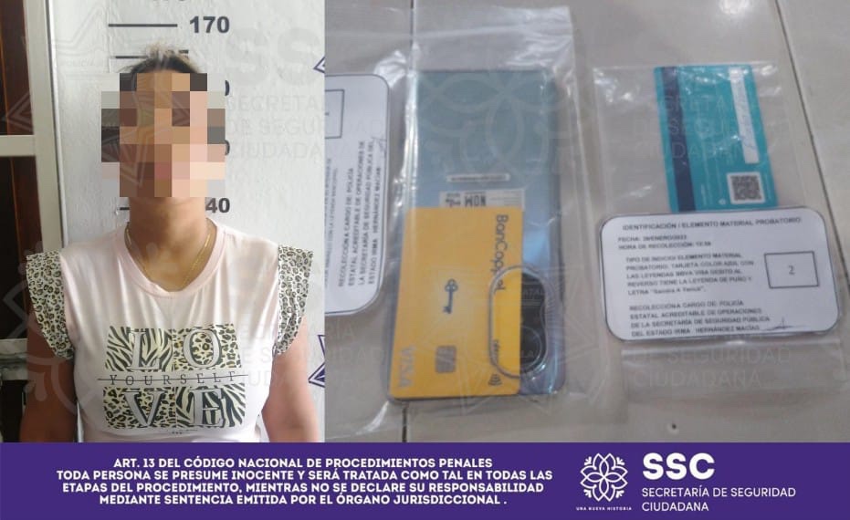 El personal de la SSC que arribó a la solicitud de apoyo, confirmó que se trata de Sandra Elena N., de 40 años de edad, a quien se le encontró la tarjeta de débito; la cual confirmó la víctima que es de su propiedad; asimismo, fue asegurado un teléfono celular marca Huawei, color azul.
