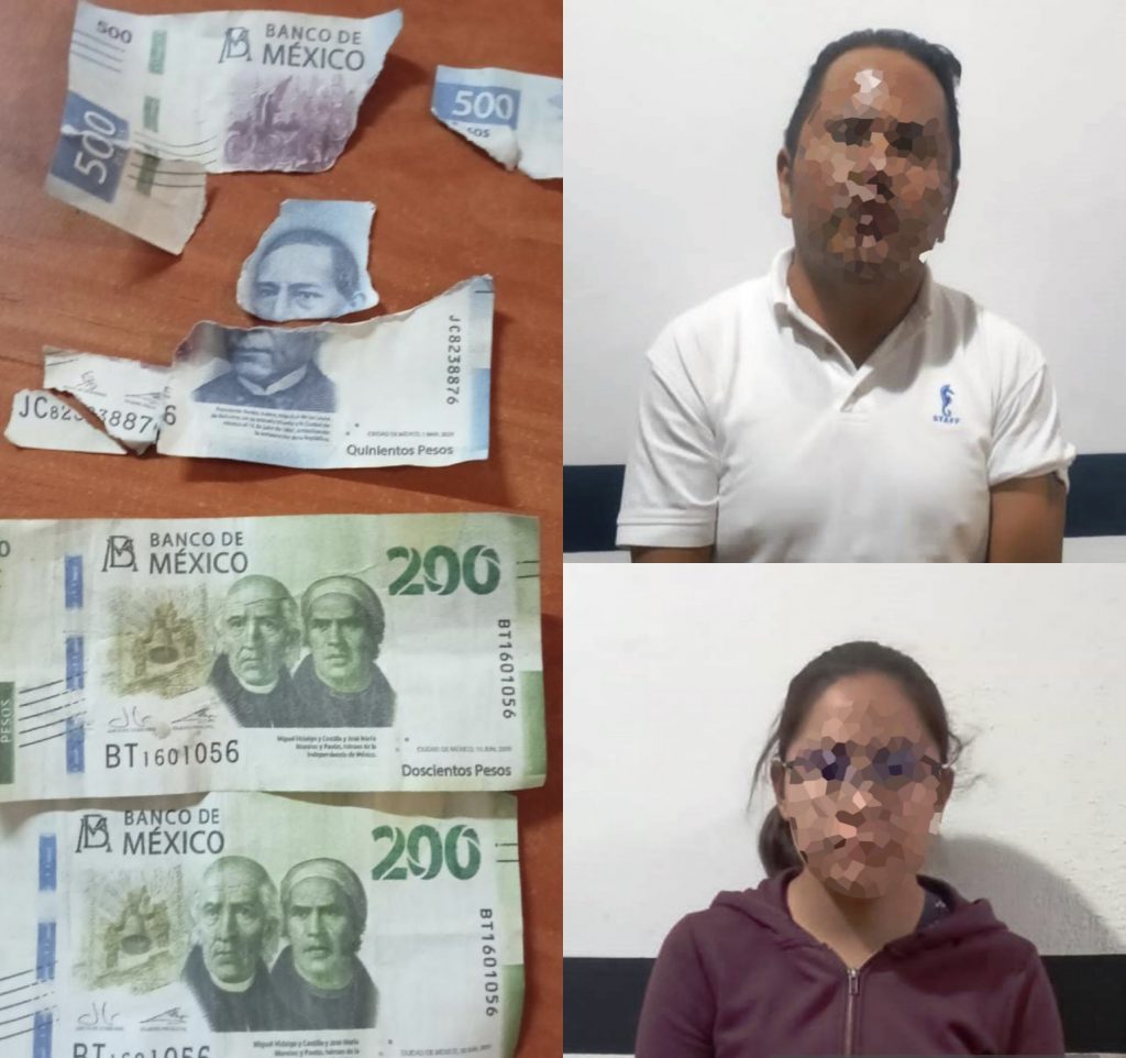 La Secretaría de Seguridad Ciudadana (SSC), detuvo a un hombre y una mujer en el municipio de Ixtenco por su posible participación en el delito de falsificación, luego de asegurar dos billetes con denominación de 200 pesos y uno más de 500, con los cuales realizaban compras.