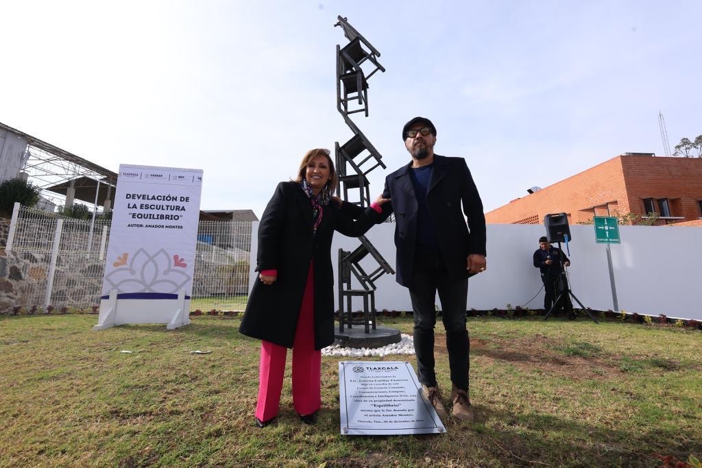 La gobernadora de Tlaxcala, Lorena Cuéllar Cisneros, develó la escultura “Equilibrio” del artista Amador Montes, en las instalaciones del Centro de Control, Comando, Comunicaciones, Cómputo, Coordinación e Inteligencia (C5i), como parte de las acciones para conjuntar el arte con la seguridad y prevención del delito.