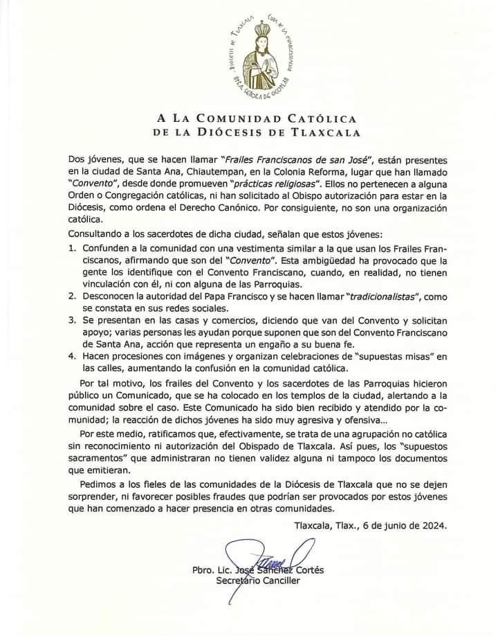En un comunicado, la Diócesis de Tlaxcala, hizo un llamado a los feligreses de tener cuidado con dos jóvenes que se hacen llamar «Frailes Franciscanos de San José»; los cuales están presentes en la ciudad de Santa Ana Chiautempan, específicamente en la colonia Reforma, en un lugar que lo han llamado «Convento», dichos jóvenes promueven «Prácticas Religiosas».