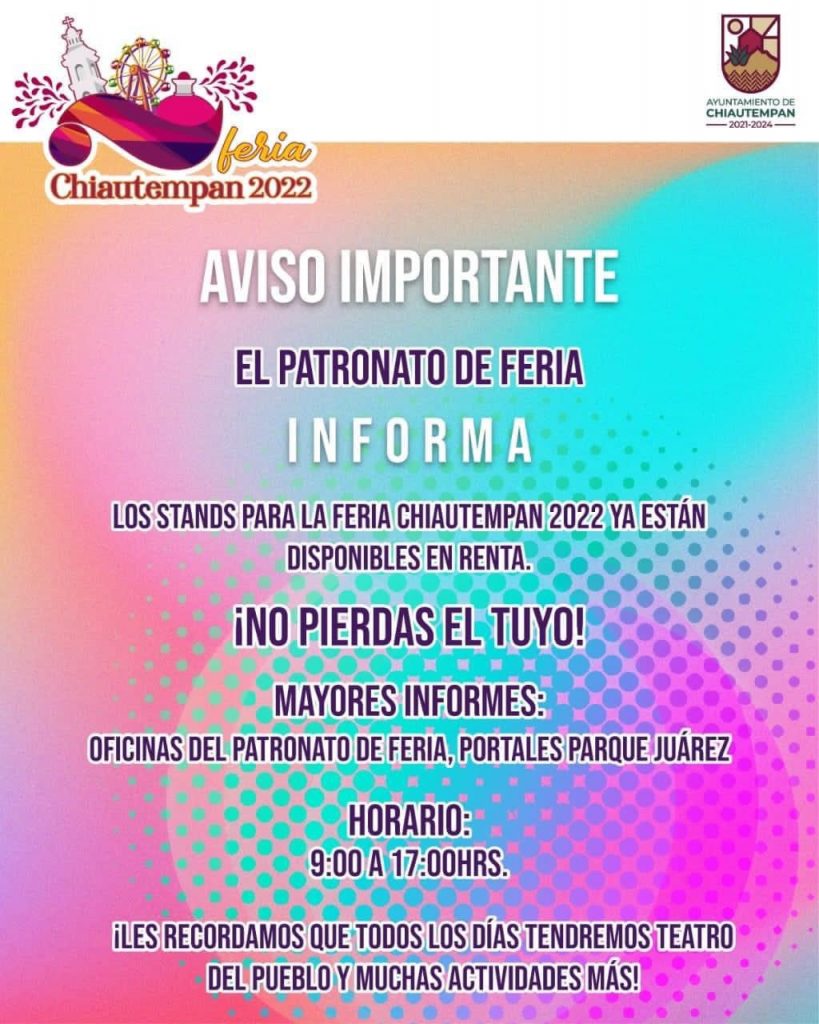 El Patronato de Feria, pone a la renta stand comerciales, durante la “Feria Chiautempan 2022”, que se llevará a cabo del 22 de julio al 2 de agosto.