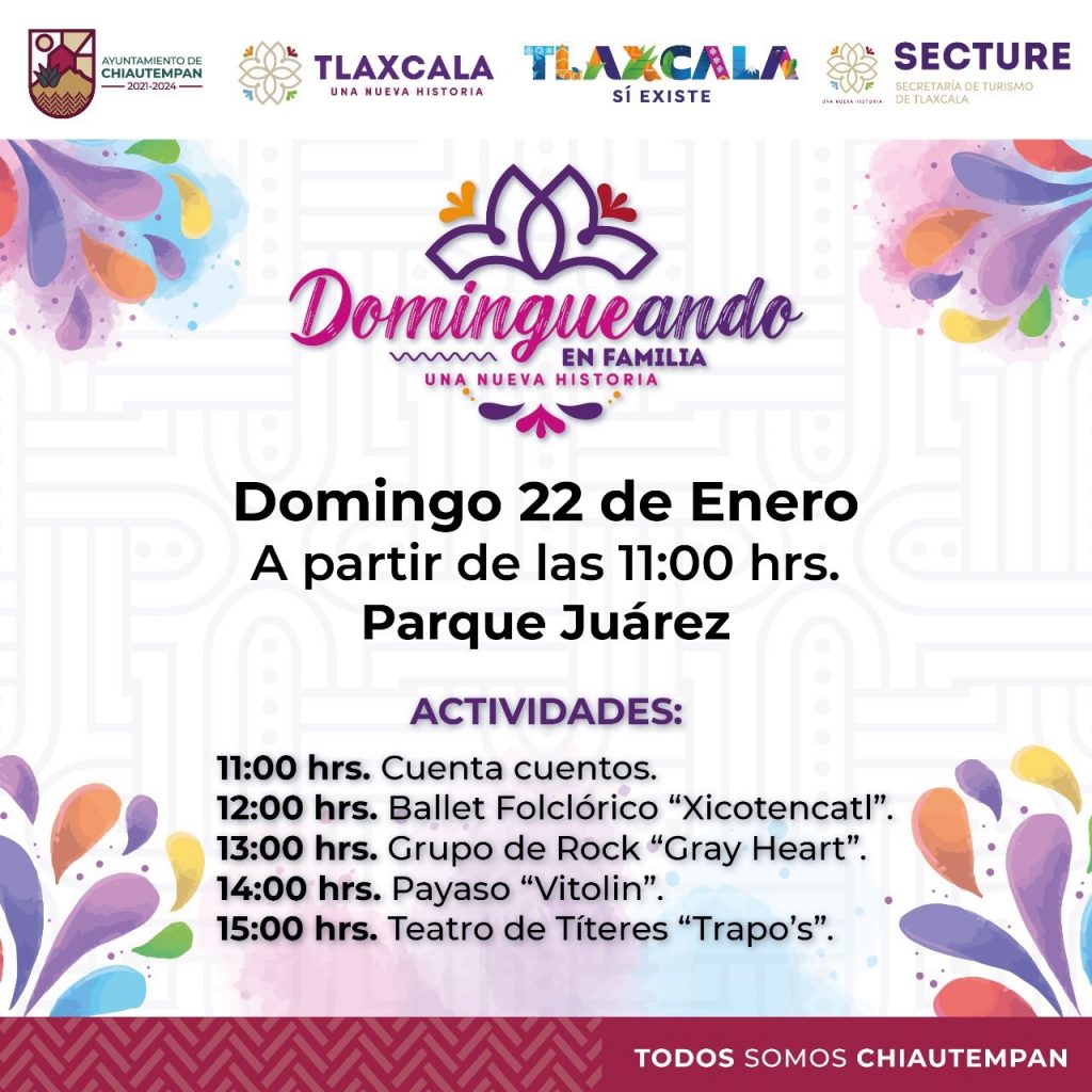 El Ayuntamiento de Chiautempan en coordinación con el Gobierno del Estado de Tlaxcala a través de la Secretaría de Turismo, invitan a las población en general a darse cita este domingo 22 de enero, a partir de las 11 horas, en el parque Juárez para disfrutar del programa “Domingueando en familia”.