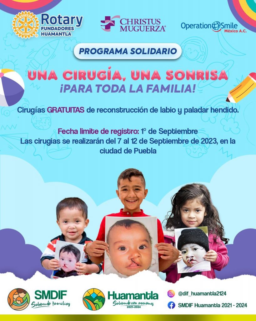 El Sistema Municipal para el Desarrollo Integral de la Familia (SMDIF) Huamantla, en conjunto con el Club Rotary Fundadores de Huamantla, Christus Muguerza y Operation Smile, brindarán el apoyo de cirugías gratuitas de reconstrucción de labio y paladar hendido a niñas, niños, jóvenes y adultos de bajos recursos, bajo el programa solidario “Una Cirugía, una sonrisa”.