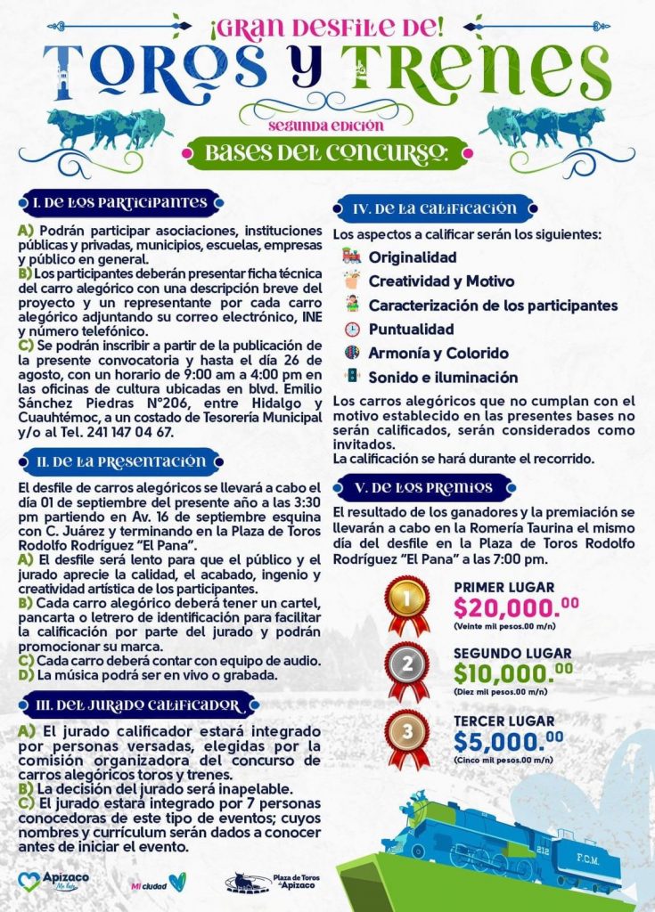El Gobierno de Apizaco invita a participar en el concurso – desfile 𝐓𝐨𝐫𝐨𝐬 𝐲 𝐓𝐫𝐞𝐧𝐞𝐬 ♉️🚂 en su segunda edición. Estás a tiempo, ¡inscríbete!, conoce las bases aquí 👇🏻