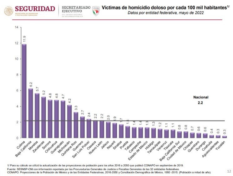 El informe del Sesnsp destaca que, en mayo el estado ocupó el tercer lugar en la tasa de incidencia delictiva por cada 100 mil habitantes al contabilizar 27 sucesos, cifra 13 veces menor a la de la media nacional que fue de 149 casos; lo anterior, representa una disminución de 2.04 por ciento respecto al mismo mes de 2021.